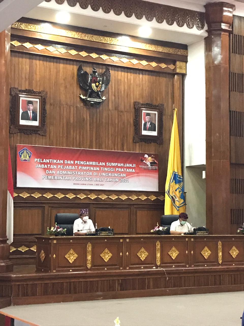 Senin, 3 Mei 2021 Biro Umum dan Protokol Setda Provinsi Bali mengatensi Kegiatan Gubernur Bali (I Wayan Koster) dalam rangka Upacara Pelantikan dan Pengambilan Sumpah/Janji Jabatan Pejabat Pimpinan Tinggi Pratama dan Administrator di Lingkungan Pemerintah Provinsi Bali Tahun 2021 yang bertempat di Gedung Wisma Sabha Utama Kantor Gubernur Bali.